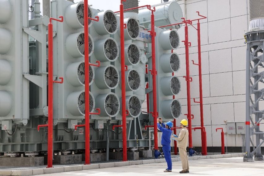 在甘孜1000千伏特高压沟通变电站,工作保护班人员观测主变压器运作时的状况。(李威 摄)